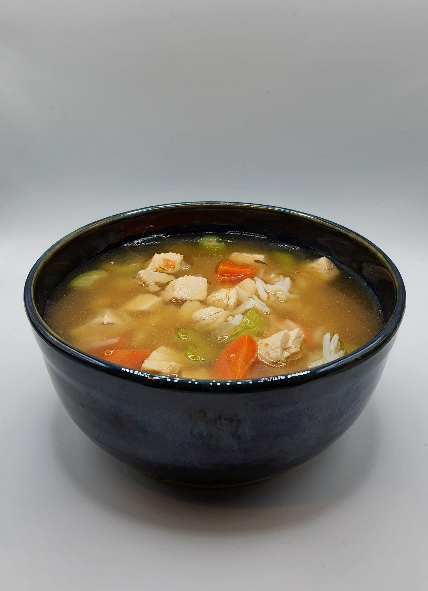 Our traditional classic is made gluten-free with rice instead of noodles, freshly roasted, all-natural chicken breast, fresh (never canned or frozen) vegetables and a delicious organic chicken stock! (While this soup is made with all gluten-free items, it is produced in the same kitchen as other products that contain gluten.)